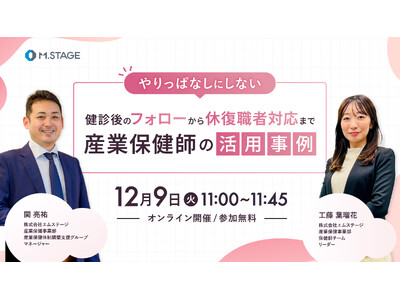 株式会社エムステージ(本社:東京都品川区、代表取締役:杉田雄二)産業保健事業部は、12/9(火)11時より、産業保健の実務を担う人事担当者の負担を軽減する「産業保健師」の活用方法を、具体的な事例を用いて解説するウェビナーを開催いたします。