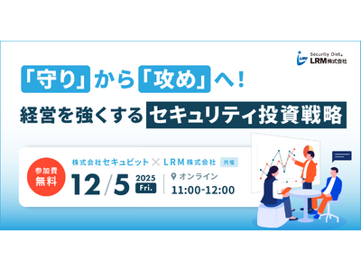 LRM株式会社(本社:兵庫県神戸市、代表取締役CEO:幸松哲也)、株式会社セキュビット(本社:東京都豊島区、代表取締役:増村洋二)は、2025年12月5日(金)11時から、「守り」から「攻め」へ!経営を強くするセキュリティ投資戦略を解説するセミナーを無料開催します。