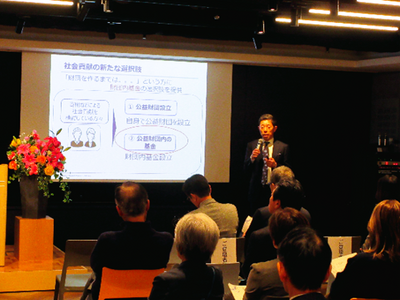 代表理事 岸本和久より、創立から5年間の活動を振り返り、社会課題解決に向けた取り組みと成果をご報告、また今後5年間と将来の展望についてもご披露しました。続いて、ソーシャルセクターや財界の方、助成先の選考に当たる選考委員の方からもお祝いの言葉や応援メッセージをいただき、今後の活動への期待が寄せられました。