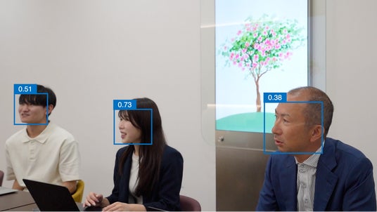 カメラで取得した会話量や笑顔の度合いに応じ、生成AIが約4分ごとに“木のアート”を1本生成し、会議室内の大型サイネージへ表示。雰囲気が悪いと“雨”、時に“動物”の演出で場を和らげるなど、会議状態を
