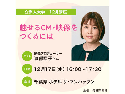12月は、日米両国で映画や、グローバル企業のコマーシャルなどを手がけてきた映像プロデューサーの渡部翔子さんがゲスト(講師)です。「魅せるCM・映像をつくるには」と題し、企業や自治体がCMを制作する際のコツなどを語ります。