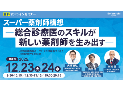クラウド電子薬歴『CARADA 電子薬歴 Solamichi』の企画・開発・販売を行う株式会社ソラミチシステムは、12月7日(日)に開催するリアルセミナー「スーパー薬剤師構想~総合診療医のスキルが新しい薬剤師を生み出す~」が既に多数の申し込みをいただいていることを受け、同セミナーの録画を12月23日(火)、24日(水)に無料配信します。