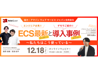 アジアクエスト株式会社(本社:東京都文京区、以下アジアクエスト)は、アマゾン ウェブ サービス ジャパン合同会社(本社:東京都目黒区、以下AWS社)の協力のもと、2025年12月18日(木)19:00よりAmazon ECSの最新アップデートと実践的な導入事例を紹介するオンラインセミナーを開催します。
