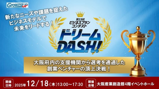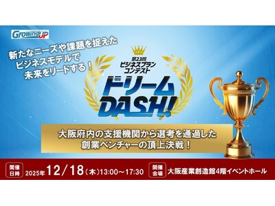 大阪起業家グローイングアップ事業(主催:公益財団法人大阪産業局/共催:大阪府)は、社会課題やニーズを独自の視点で的確に捉え、その解決に強い使命感を持つ起業家を支援しています。既存の製品・サービスを上回る価値を顧客へ提供し、持続安定的な収益、さらには経済への好循環・波及効果が期待できるビジネスプランを発掘する場として、毎年【ビジネスプランコンテスト ドリームDASH!】を開催しています。