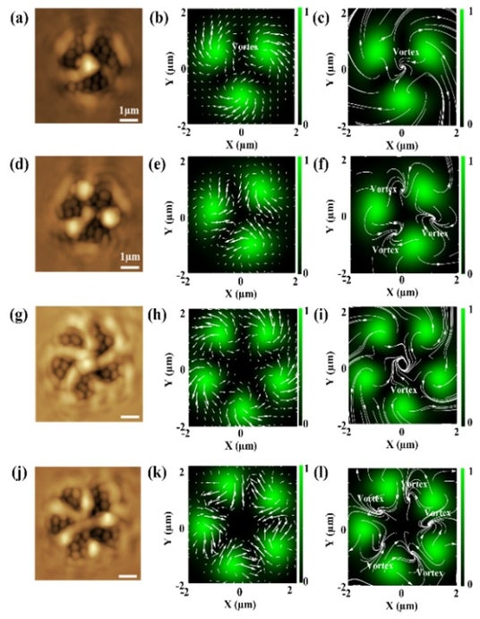また光の回転方向(円偏光の向き)を変えると、多重光渦の中央部の突起が消滅し、周辺に複数の突起が現れ、螺旋を描いていた腕はまっすぐに伸びました(腕の数は変化しません)(図1-d, j)。円偏光の向きによらず、多重光渦の光強度分布は変化しません。これは光の「スピン軌道相互作用」と呼ばれる効果によるもので、多重光渦の中央部の渦が消滅し、多重光渦の周辺部に新たに複数の渦が生成したことを意味します。すなわち、光の渦がアゾポリマーのような光感受性を有する物質の質量移動を介して顕在化・可視化できたことになります(図1)。