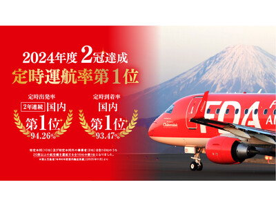 株式会社フジドリームエアラインズ(略称:FDA、本社:静岡県静岡市、代表取締役社長:本田 俊介)は、2025年11月に国土交通省が発表した『航空輸送サービスに係る情報公開』において、特定本邦航空運送事業者(10社)及び特定本邦航空運送事業者以外の事業者(8社)の合計18社のうち、20席以上の航空機を運航する全16社の中で、2024年度における定時運航率が出発94.26%、到着93.47%と、出発・到着便ともに第1位となり2冠を達成しました。なお、2023年度は出発便における定時運航率第1位を獲得しています。