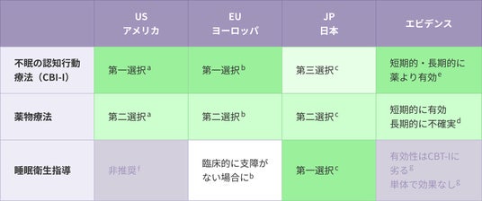 [a] 米国内科学会不眠症診療ガイドライン2016 (PMID: 27136449) / [b] 欧州不眠症診療ガイドライン2017(PMID: 28875581)[c] 日本睡眠学会睡眠薬の適正使用・休薬ガイドライン. 2014. / [d] De Crescenzo, et al. Lancet. 2022. / [e] Furukawa Y, et al. Psychiatry Clin Neurosci. 2024.[f] 米国睡眠学会不眠症の行動・心理的治療ガイドライン2021 (PMID: 33164742)./ [g] Furukawa Y, et al. JAMA Psychiatry 2024.