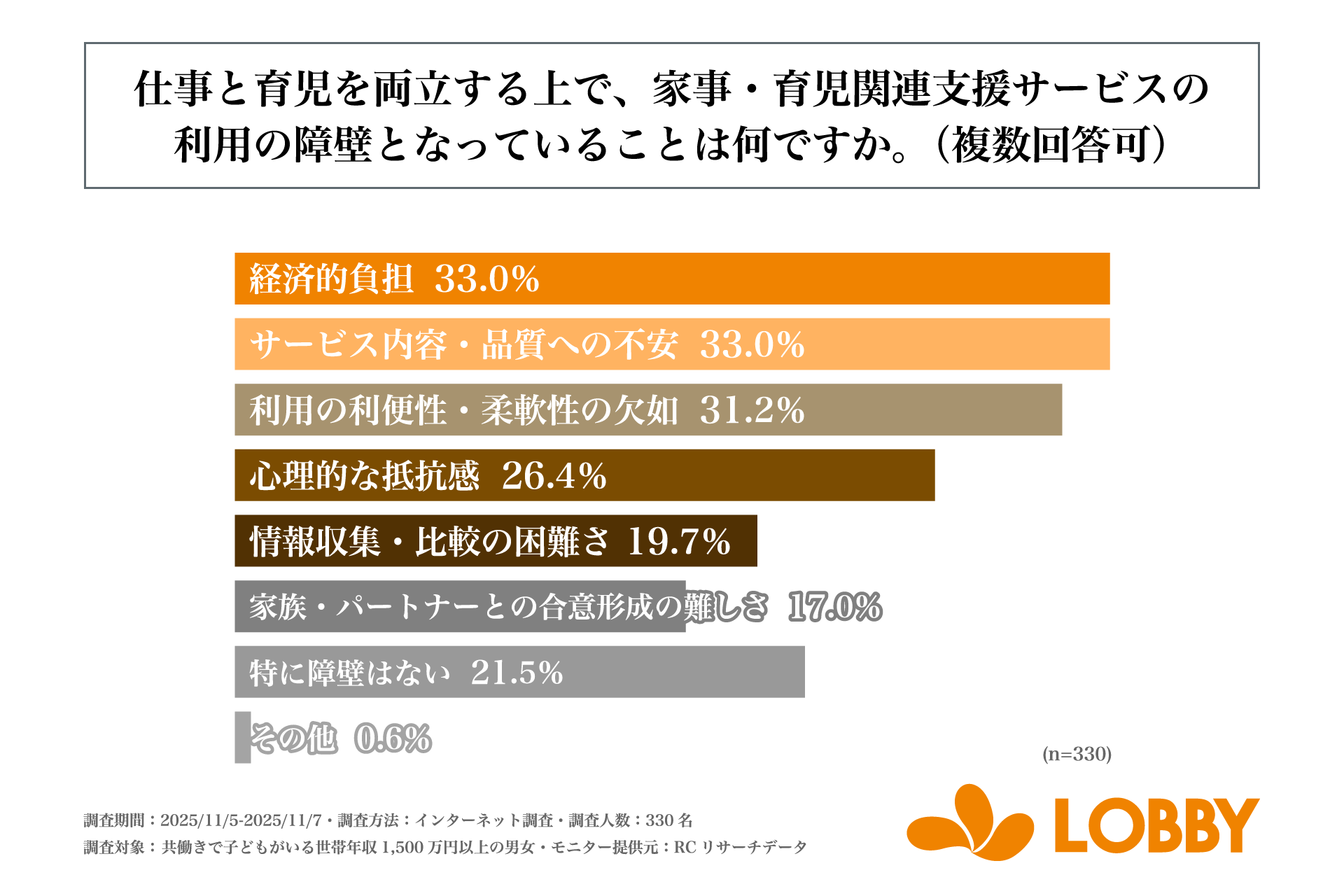 次に、「仕事と育児を両立する上で、家事・育児関連支援サービスの利用の障壁となっていることは何か」を尋ねる設問への回答では、1位が同率で「経済的負担」と「サービス内容・品質への不安」で33.0%、3位が「利用の利便性・柔軟性の欠如」で31.2%という結果になりました。この結果から、仕事と育児を両立する上で、家事・育児関連支援サービスの利用の障壁となっていることは主に「経済的負担」や「サービス内容・品質への不安」であることがわかりました。