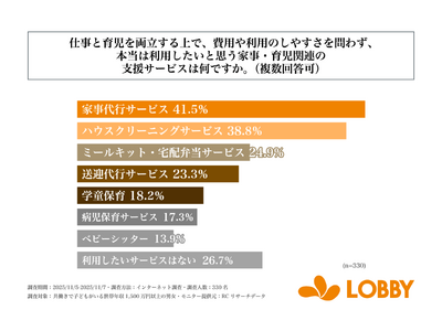 株式会社ロビー(本社:東京都新宿区、代表取締役:対馬 誉仁)が運営する家事代行サービス「LOBBY」は、共働きで子どもがいる世帯年収1,500万円以上の男女を対象に「世帯年収1,500万円以上の共働き子育て世帯の仕事と育児両立に関する調査」を実施しました。この調査から、共働きで子どもがいる世帯年収1,500万円以上の男女が仕事と育児を両立する上での課題や、家事・育児関連支援サービスの利用実態などが明らかになりました。