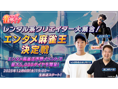 これを記念して、2025年12月6日(土)19:00より、3名が麻雀で対局するイベント「レンタル系クリエイター大集合!エンタメ麻雀王決定戦」を雀エボライブYouTube公式チャンネルにて生放送することをお知らせします。