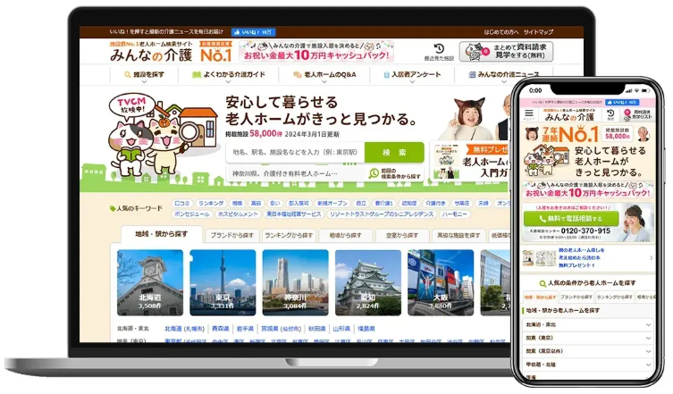 「みんなの介護」は、全国の老人ホーム・介護施設情報を網羅し、希望条件に合わせた複数施設の資料を一括請求できる国内最大級の介護施設検索サービスです。自宅や勤務先から手軽に情報収集と比較検討ができ、介護の初期検討フェーズに必要な情報をワンストップで提供しています。月間約20,000件の新規資料請求が寄せられ、働く子世代を中心に幅広いユーザーに利用されています。