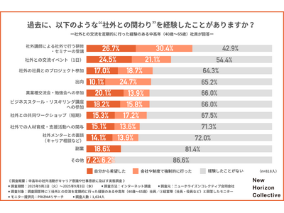ニューホライズンコレクティブ合同会社(本社:東京都港区、代表:山口 裕二、野澤 友宏)は、1.社外との交流を定期的に行った経験のある中高年(40歳~65歳)社員/2.経営陣(社長・役員など)を対象に、中高年の社外活動がキャリア意識や愛社精神に及ぼす実態調査を行いました。
