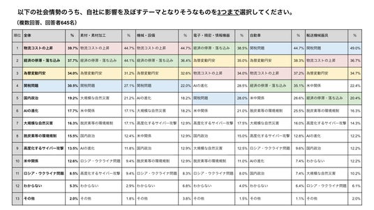 ・全体として関心度が高かったのは「物流コストの上昇(39.7%)」、「経済の停滞・落ち込み(37.7%)」、「為替変動円安(34.0%)」、「関税問題(30.5%)」の4つで、いずれも回答者の約3人に1人以上が自社に影響を及ぼすと考えていることがわかりました。