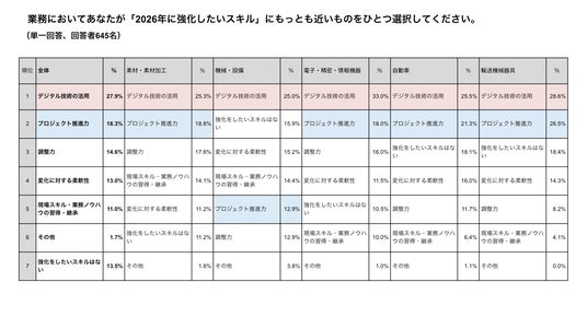 ● 2026年に強化したいスキルとして、全体で最多となったのは「デジタル技術の活用(27.9%)」。約4人に1人が、今後の業務に向けデジタルスキルを強化したいと考えていることが明らかになりました。