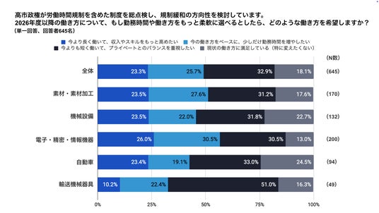 ● 労働時間規制について「今より長く働きたい」層が約半数。長く働く意欲を持つ層が一定存在する実態が明らかになりました。