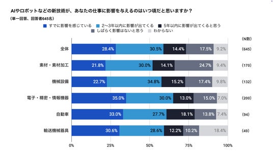 一方、最も低かった素材・素材加工では「すでに影響を感じている」が21.8%にとどまり、「しばらく影響はないと思う(24.7%)」が最多となるなど、技術変化への距離感に差が出ています。
