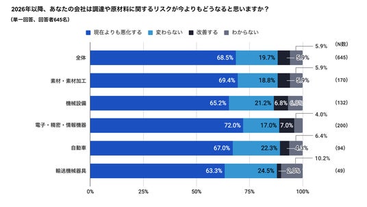 ・2026年以降の調達や原材料に関するリスクについて、全体の68.5%が「現在よりも悪化する」と回答しており、最も多い選択肢となりました。