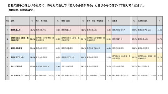 さらに、自動車や輸送機械器具といった大規模産業では「意思決定プロセス」が最大の課題として浮上しました。関係者や承認者が多い産業構造が影響しており、変化の速い市場に対応するためには、人手不足や属人化の解消に加えて、意思決定のスピードも競争力の源泉になりつつある実態が見えてきました。
