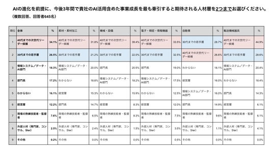 ● 今後3年でAI活用を含む事業成長を牽引する人材層として「40代までの次世代リーダー候補」「30代までの若手層」に期待が寄せられていることが明らかになりました。