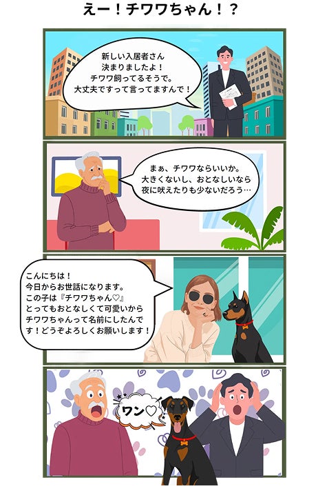 “チワワちゃんという名前のドーベルマン”がやってきた――という“漫画のような本当の話”も起きています(※当社4コマより)。