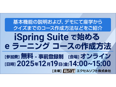 エクセルソフト株式会社 (東京都港区) は、 iSpring Suite で始める e ラーニング コースの作成方法 無料セミナーをオンラインで 2025年 12月 19日 (金) に開催いたします。