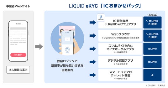 LIQUID eKYCのICおまかせパックは、マイナンバーカードや運転免許証などのICチップを活用した本人確認方式を一式提供し、各ユーザーに対して離脱率が最も低い読み取りチャネルを自動で案内するサービスです。事業者は特別な開発が不要で、1つのAPIで、ル方式を含む多様なIC読み取り方式に対応します。