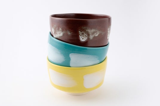 抹茶碗 辰砂白流し、蒼釉白刷毛目、黄釉白刷毛目