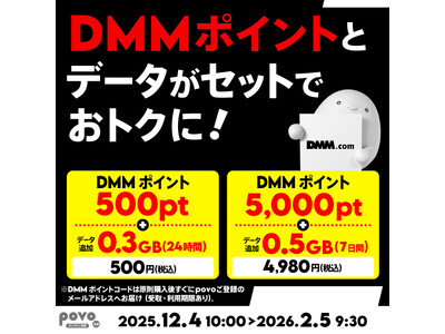 KDDI、沖縄セルラーは2025年12月4日から、povo2.0の「コラボトッピング」として、「DMMポイント500pt」と「0.3GB(24時間)」がセットになったトッピングを500円、大容量の「DMMポイント5,000pt」と「0.5GB(7日間)」がセットになったトッピングを4,980円で提供します。