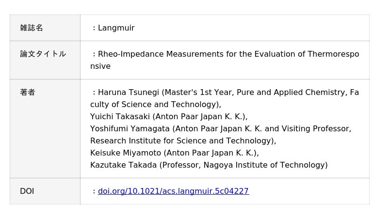 四反田准教授は「本解析手法は、構造変化を電気信号で捉えることにより、従来の粘度・弾性測定だけでは捉えきれなかった"流れ+構造+電気応答"の三次元的な捉え方が可能になります。将来的にDDSやソフトアクチュエータ、刺激応答性高分子システムなどの挙動評価への貢献が期待されます」とコメントしています。
