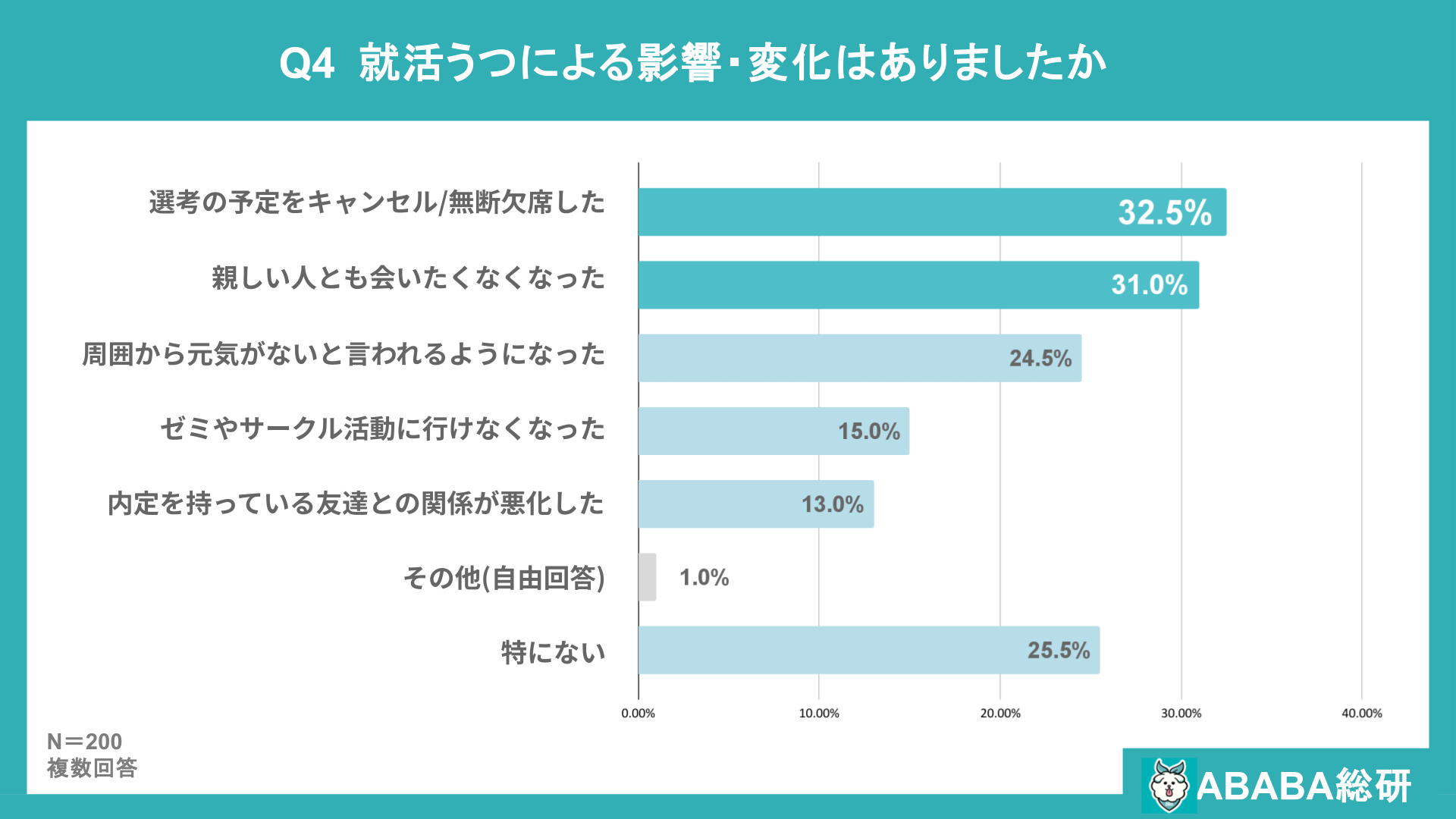 4. 就活うつによる影響は、「選考をキャンセル・欠席」、「親しい人とも会いたくなくなる」など、