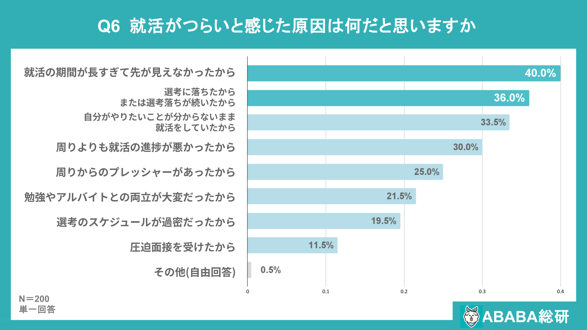 6. 就活がつらいと感じた原因は「期間が長すぎて先が見えなかった」が40.0%で最多。