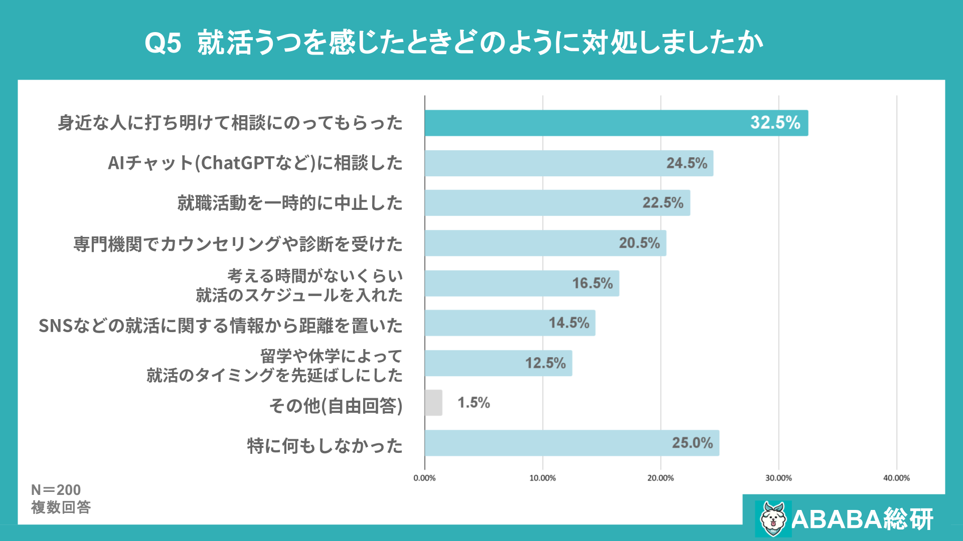 就活うつを感じたときの対処法を尋ねたところ、「身近な人に打ち明けて相談にのってもらった」が32.5%で最多となりました。一方で、「特になにもしなかった」が25.0%に上り、4人に1人が誰にも相談せず一人で抱え込んでいる実態が明らかになりました。