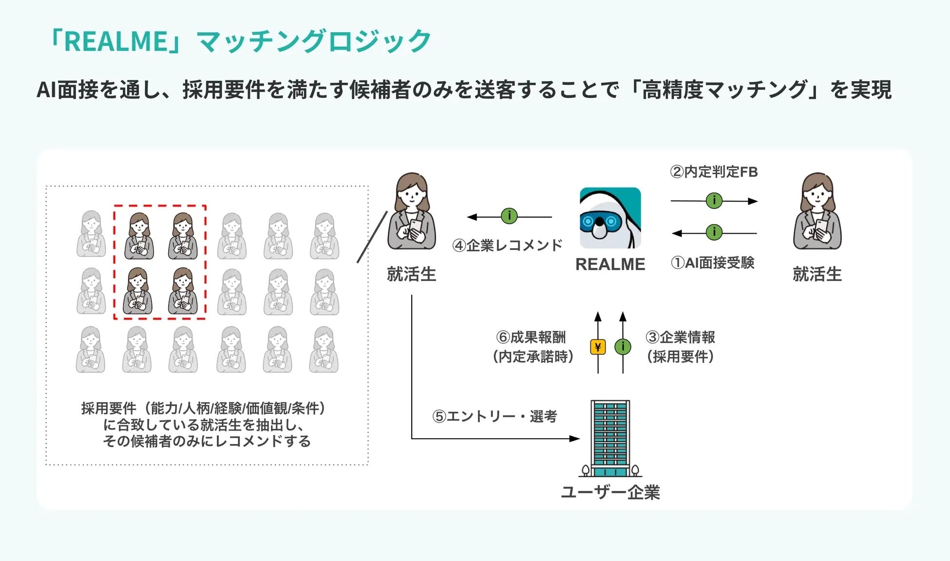 『REALME』は、AI面接を通して定量化された学生の能力・価値観をもとに、自社の採用要件を満たす学生とマッチングができるサービスです。