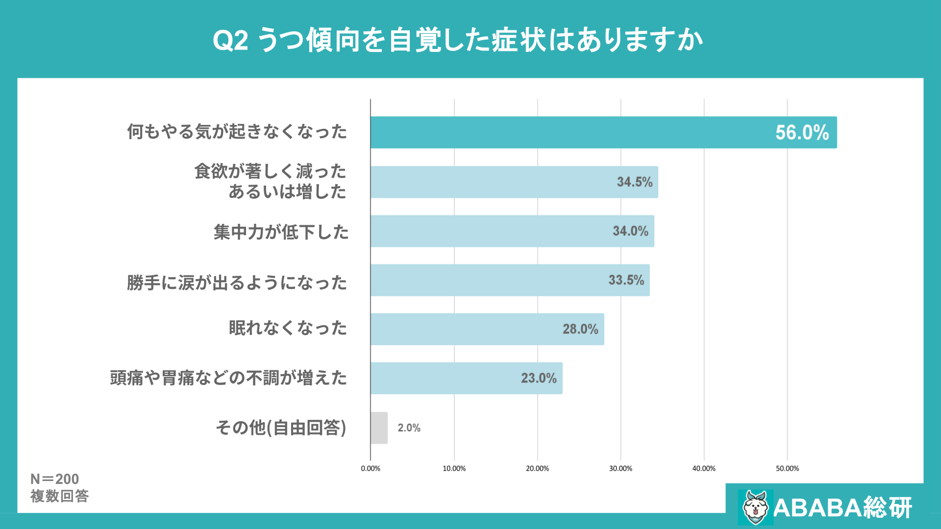 「やる気が起きない」が56.0%で最多。「食欲の変化」、「涙が出る」など多岐にわたる症状。
