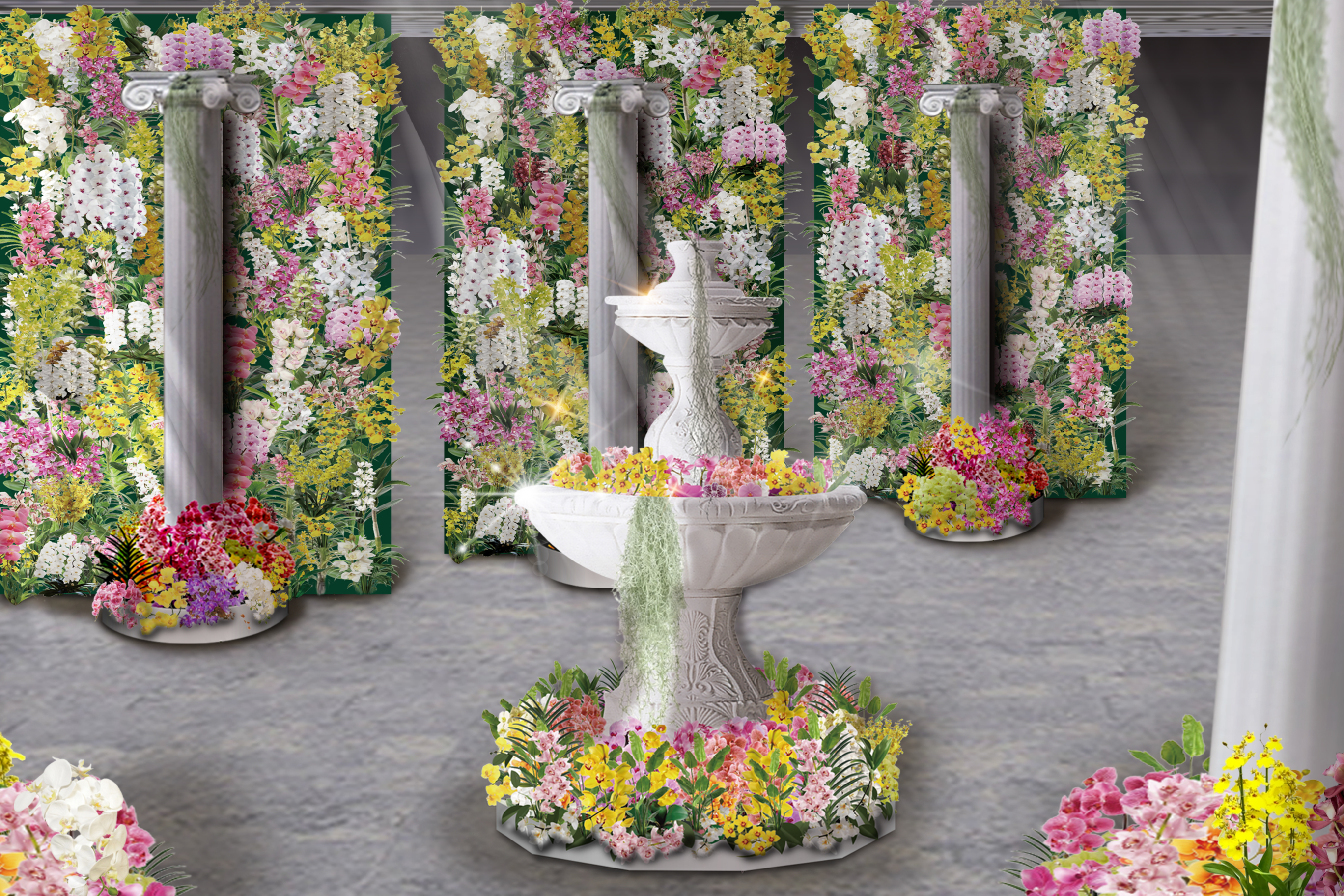 はじめに来場者をお迎えする「オーキッド・ゲート2026」は、蘭と白亜の柱が醸す厳かな空間への入口です。続いて「オーキッド・テラス」が登場。あふれる泉のように降り注ぐ蘭が時間を忘れさせてくれます。そしてたどり着く「オーキッド・パレス」の中心に今回の日本大賞花が燦然と輝き、思わず写真に収めたくなる空間が来場者を待っています。