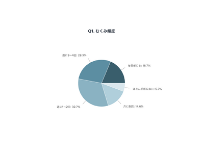 その結果、「毎日感じる」が18.7%、「週に3~4回」が28.3%、「週に1~2回」が32.7%となり、週に1回以上むくみを感じている方が79.7%にのぼることが分かりました。