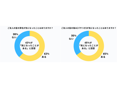 アンケートの結果によると、「ご友人の髪の薄毛が気になったことはありますか?」「ご友人の髪の毛の傷み(パサつき)が気になったことはありますか?」という質問に対し、いずれも6割以上の人が「気になったことがある」と回答。多くの方が、思っている以上に人の髪に注目していることが分かりました。