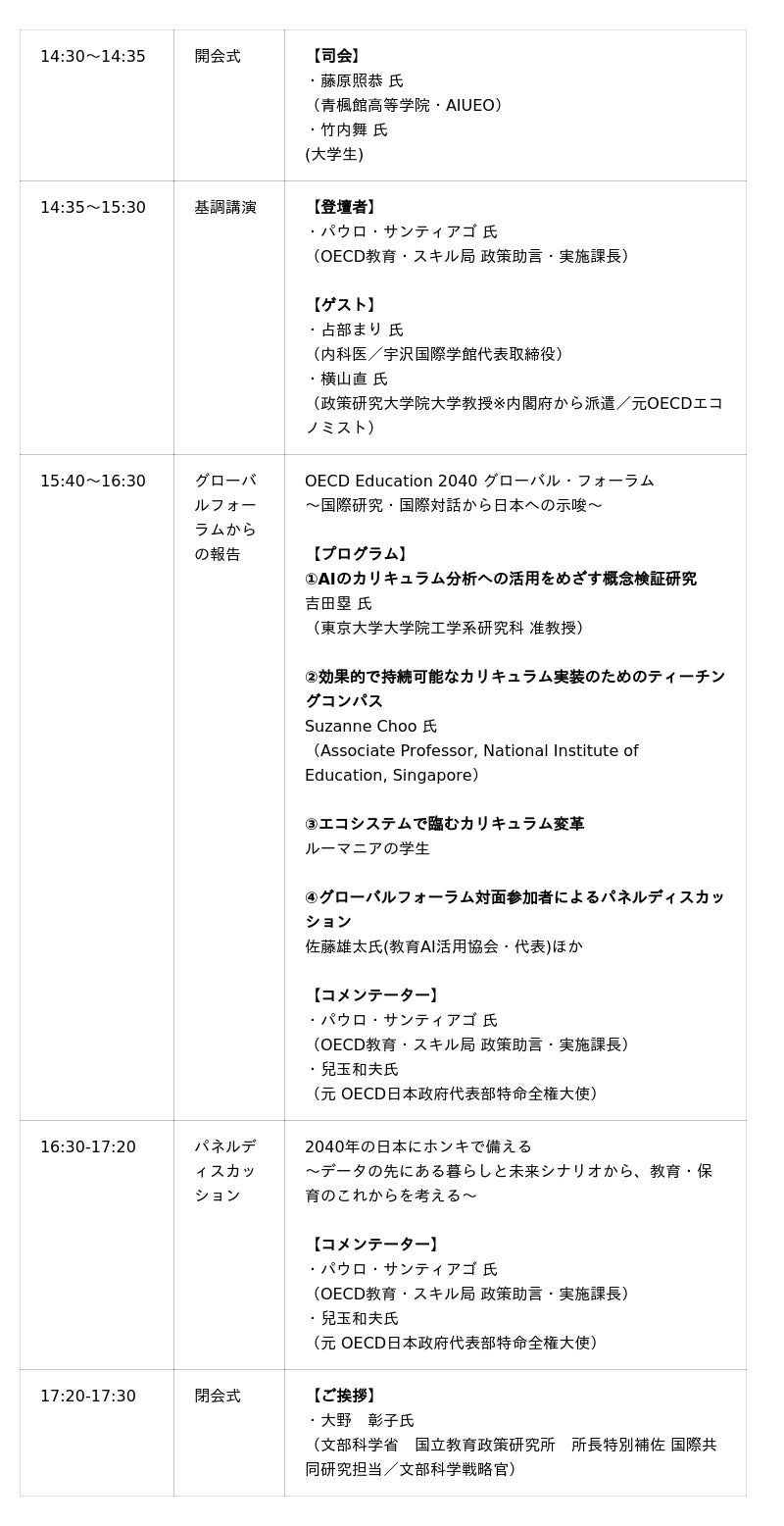 この度、「日本OECD共同研究」の一環として、OECD教育スキル局のパウロ・サンティアゴ氏を迎え、2040年のウェルビーイング溢れる社会の実装に向けた教育シンポジウムを開催します。日本は少子化、高齢化、労働力不足、格差拡大など、多くの国が今後直面する課題の中にあり、既存の教育システムの限界が露呈しています。そこで、「過去を超え、常識を超え、国境を超え、2040年の日本をデザインする」をテーマに、国内外の登壇者とともに、多様なステークホルダーの視点から2040年の日本を構想します。国際と国内が協働し、未来実装の取り組みをエコシステムでデザイン・加速させるスタートの場として、皆様のご参加をお待ちしています。