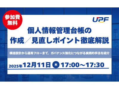 リスクマネジメント分野のコンサルティングサービスを提供する株式会社UPF(本社:東京都中央区、代表取締役:仲手川 啓、以下当社)は、2025年12月11日(木)17:00より、個人情報管理台帳の作成から運用までを体系的に学べる無料オンラインセミナーを開催いたします。