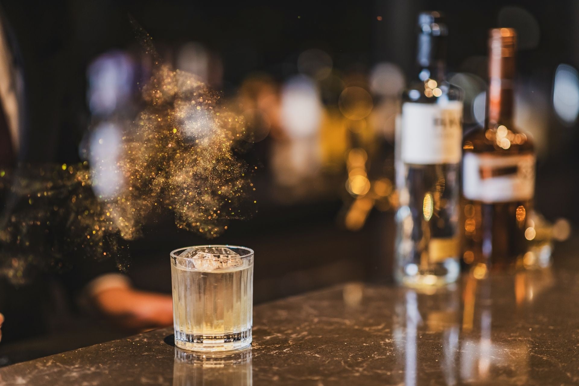バーテンダーが丁寧にダイヤモンドカットをした氷を入れたグラスに、シェイクしたカクテルを染み渡るように注ぎ、アクセントに「リキュールの女王」と称される希少なシャルトリューズを垂らします。仕上げにカクテル全体へ振りかける金粉は、夜景のようにキラキラと輝きます。