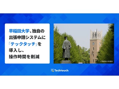 テックタッチ株式会社は、学校法人早稲田大学の教職員および学生向け出張申請システム「e-Trip」へのAI型デジタルアダプションプラットフォーム(DAP)「テックタッチ」の導入により、システムの利便性向上を実現したことをお知らせします。今回、システムのUI改修と並行して、「テックタッチ」を実装。利用者である教職員および学生の出張申請の時間が短縮されるなど、ユーザー体験の向上と業務効率化に貢献しました。