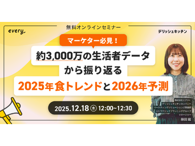 株式会社エブリー(本社:東京都港区、代表取締役:吉田 大成、以下エブリー)が運営するレシピ動画メディア『デリッシュキッチン』は、同メディアが保有する約3,000万の生活者データを用いた無料ウェビナーを12月18日(木)に開催します。アプリ・SNS両媒体のヒットレシピ・ユーザー行動から2025年の食トレンドを振り返り、2026年のトレンドを予測します。