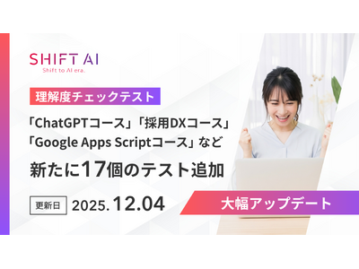 「日本をAI先進国に」を掲げAIのビジネス活用を学べる利用者数No.1※の生成AI学習コミュニティ「SHIFT AI」を運営する株式会社SHIFT AI(東京都渋谷区、代表取締役 木内翔大、以下当社 )が2025年8月より提供開始した、法人向けリスキリングサービスSHIFT AI for Bizのオンライン学習プラットフォームにおいて、受講後の理解度を定量的に測定できる「理解度チェックテスト」機能を大幅にアップデートしたことをお知らせします。今回のアップデートではツール別コース、職種別コース、価値別コースなど、新たに17コースの理解度チェックテストを追加しました。受講者は受講直後にテストを受けることで自己理解度を確認でき、管理者は学習効果の把握と次の研修計画策定に活用できます。