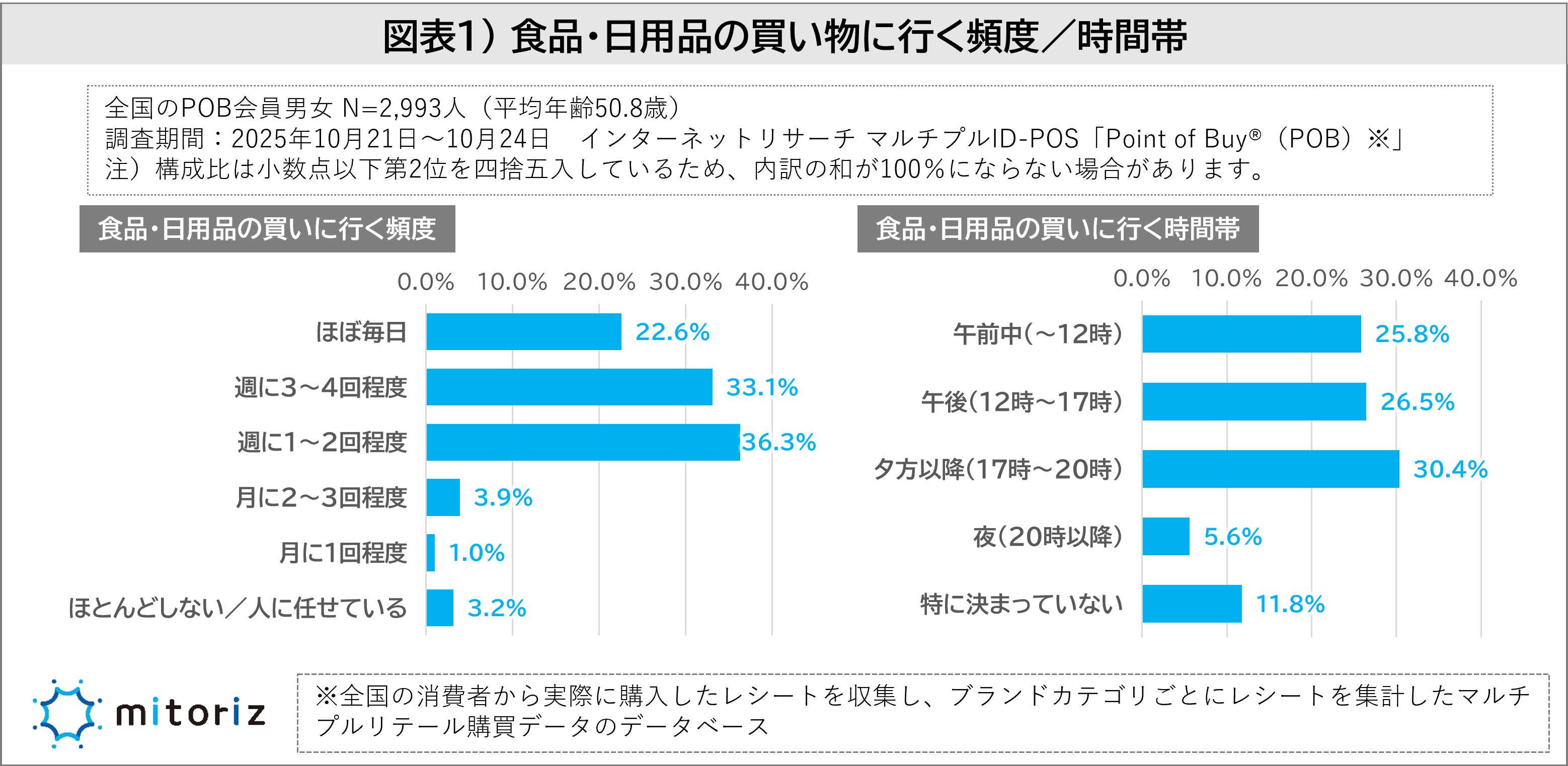 株式会社mitoriz(本社:東京都港区、代表取締役社長:原田光幸)は、消費者購買行動データサービス「Point of Buy(R)(以下、POB)」の会員2,993人を対象に「食品と日用品の買い物に関する調査」を実施しました。