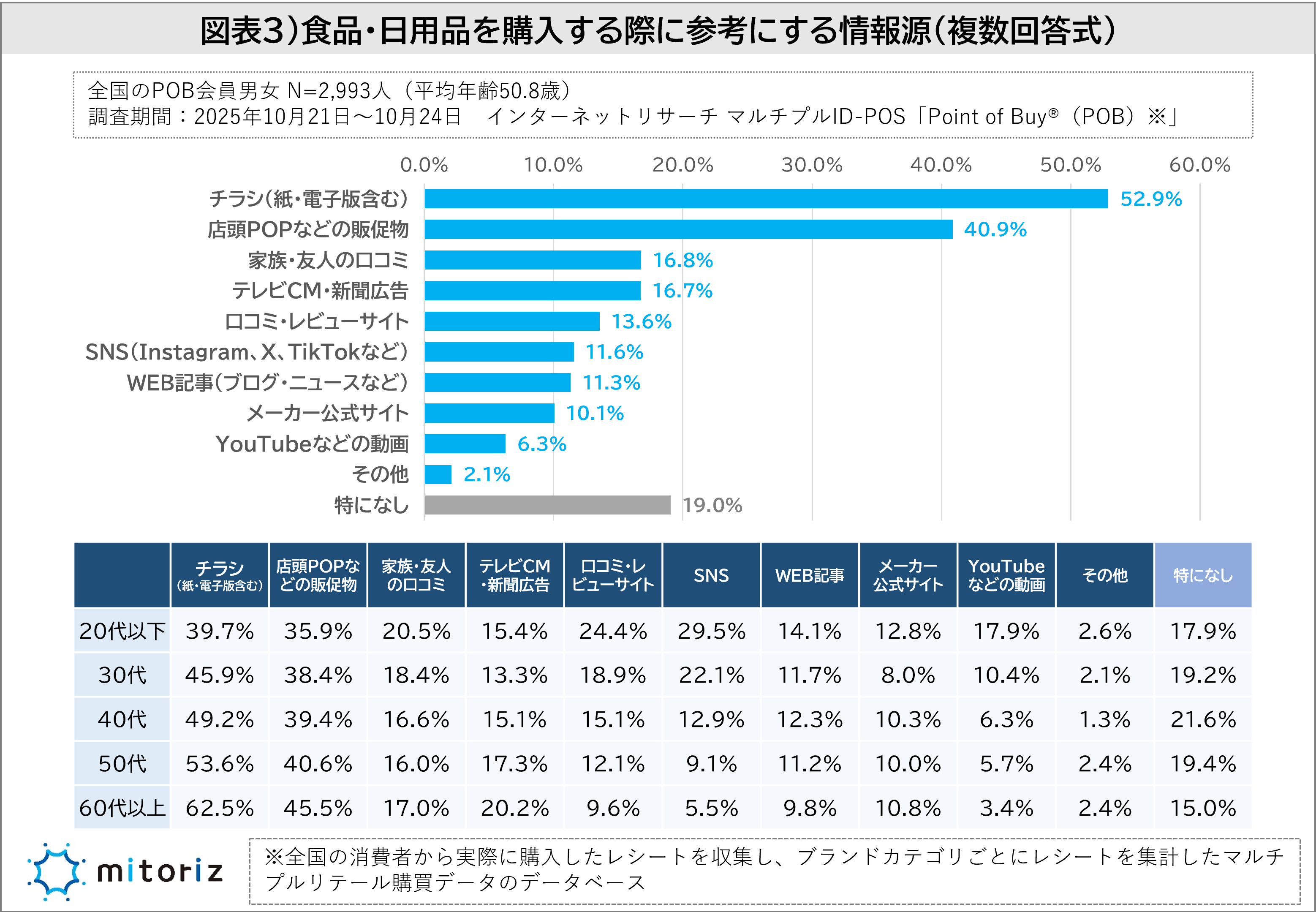 参考にする情報源は「チラシ(52.9%)」と「店頭POP(40.9%)」が上位、若年層ほど口コミも重視