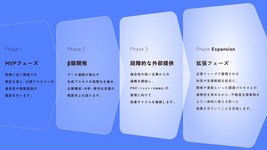 Phase3で蓄積される知見や支援範囲を起点に、開発や運営といった関連プロセスとの連携性を高めながら、不動産企画業務をより一体的に扱える形へと発展させていくことを目指します。