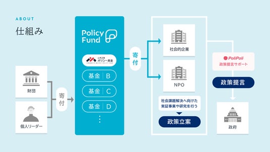 PoliPoliのプロジェクト『Policy Fund(ポリシーファンド)』の、第一号寄付基金として設立されました。寄付者である株式会社kubell 代表取締役CEO 山本正喜氏の個人活動として、「教育」「少子化」「地方創生」「貧困」「女性活躍」の5つのテーマで、政策提言による社会課題の解決に取り組む団体を募集し、寄付と政策提言のための支援を行っています。