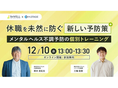 株式会社エムステージ(本社:東京都品川区、代表取締役:杉田雄二)産業保健事業部は、12/10(水)13時より、メンタルヘルスケアをテーマに、「個」の課題に着目し、休職を未然に防ぐ新しい予防策としてのメンタルヘルス不調予防の個別トレーニングについて解説するウェビナーを開催いたします。