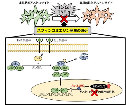 これらの結果から、スフィンゴミエリンの産生を阻害することでHDAC1およびHDAC3 の発現量が増加し、その結果 p65のアセチル化とNF-κB経路の活性化が抑えられ、アストロサイトの異常活性化が抑制されるという、スフィンゴ脂質を介したアストロサイトの新たな活性化制御機構が解明されました(図2)。