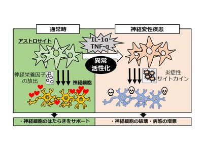 私たちの脳内には神経細胞の他にアストロサイトと呼ばれる細胞が存在しており、神経栄養因子 (神経細胞の成長に必要な栄養成分) を放出することで神経細胞の活動をサポートしています。一方で、神経変性疾患においてアストロサイトは、インターロイキン1α (IL-1α) や腫瘍壊死因子 (TNF-α) などのタンパク質により異常に活性化し、炎症性サイトカイン(注2)の放出を行い、神経細胞を破壊することで病態の増悪を引き起こすことが知られています(参考文献1)。アストロサイトの異常活性化は、多くの神経変性疾患で共通して見られることから神経変性疾患に対する新たな治療標的として注目されています(図1)。